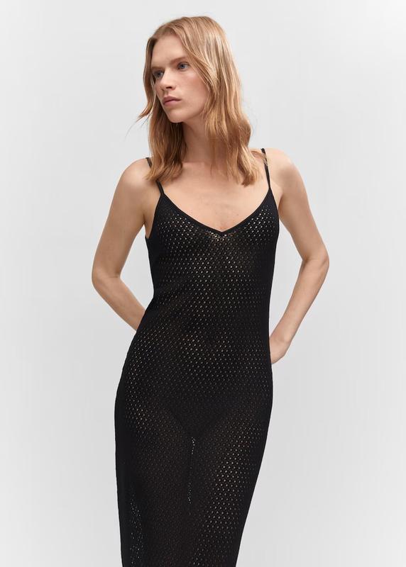 Ажурний трикотаж. Приталений крій. Довга модель. Декольте. Тонкі бретелі. Виріз на спині. Без застібки. 66% поліестер. 34% бавовна. S, М,L,XL в наявності Чудова якість S: Довжина згори брителі 127 Пог 40 Пот 38 Пос 45