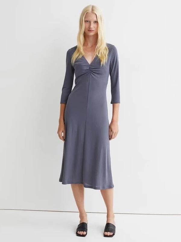 Елегантна сукня міді від H&M у стильному сірому кольорі. Особливості: • V-подібний виріз з декоративними складками • Рукави 3/4 довжини (51 см) • Приталений силует • Довжина 121 см Параметри розміру L: • Напівобхват груди: 49-63 см • Талія: 41-62 см • Стегна: 54-68 см Матеріал: 100% поліестер Стан: нова Бренд: H&M Універсальна модель для офісу та повсякденного носіння. Зручна посадка завдяки еластичним властивостям тканини.