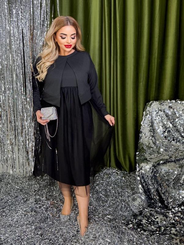 🩷Сукня🩷 Модель: 168 🟣Размер: 48-52, 54-58, 60-64 Цена: 1450 грн Ткань: двунитка+ евросетка Цвет: черный Стильное платье, имитация двойки. Сарафан+болеро (сшитые вместе) Ткань трикотаж двунитка люкс качества, имеет растяжимость. Мягкая сетка, не колется. ✅Замеры: 🩷48-52 Обхват груди 106 см Обхват стегон 112 см Длина рукава 69 см Длина изделия 110 см 🩷54-58 Обхват груди 118 см Обхват стегон 126 см Длина рукава 72 см Длина изделия 112 см 🩷60-64 Обхват груди 128 см Обхват стегон 130 см Длина рукава 73 см Длина изделия 115 см