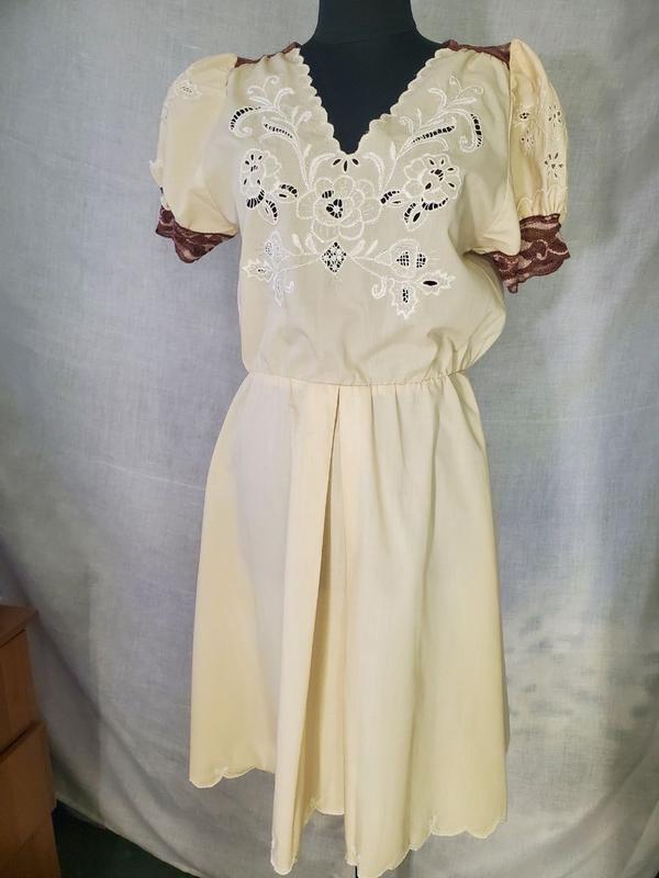 Платье светобежевого цвета, из натуральной ткани- 100% хлопок, с невероятной, изящной вышивкой. Плечи- 35см, ПОГ- 50см, ПОТ- 35см, тянется на резиночке до 42см, ПОБ- 60см, длина рукава- 24см, ширина рукава- 14сс, тянется за счет стрейча в декоре рукава до 18 см, длина платья- 104см.
