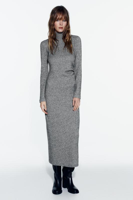 1058/156/803 ОПИС Длинное платье облегающего кроя из ткани Soft Touch. Высокий воротник в рубчик, длинные рукава. Сборки сбоку. СОСТАВ: 82% полиэстер, 13% вискоза, 5% эластан РАЗМЕРЫ В НАЯВНОСТИ: L: общая длина от плеча – 128 см, шир. по спинке – 46см, штанин в районе талии – 39см, штанин. в рай. бедер – 48см, длин. пл.шва – 11см, рукав от плеча – 60см, внутр. дл. рукава -47см.