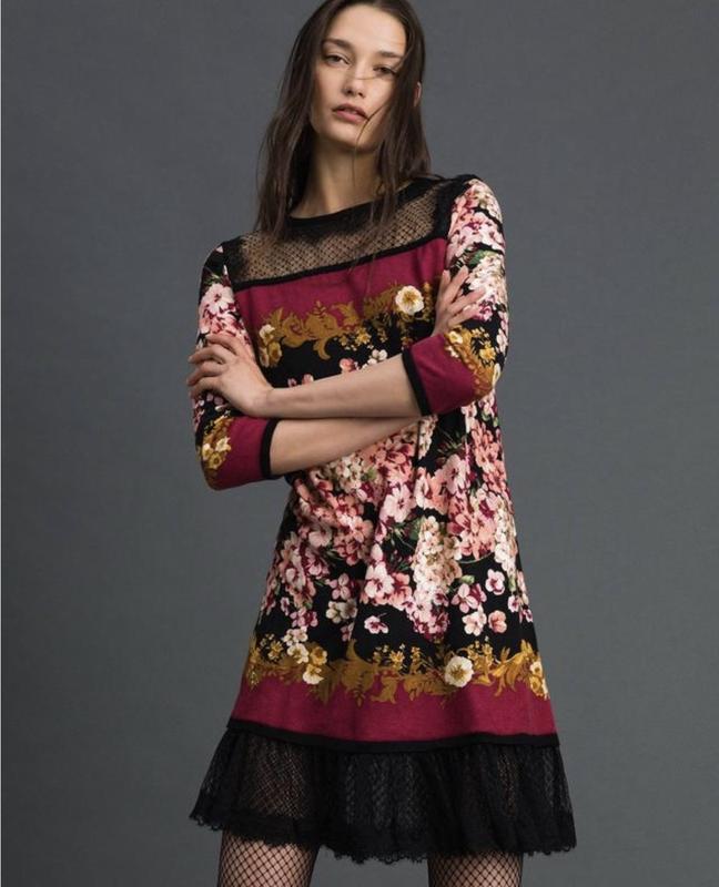 Трикотажное платье с платочно-цветочным принтом, кружевом, кокеткой из сетчатого тюля и вставками из ажурного кружева Twin-Set. Платье прямого кроя. Состояние новой вещи, выгуливалось один раз на пару часов. ПОГ-53 Длина-93 Рукав-45