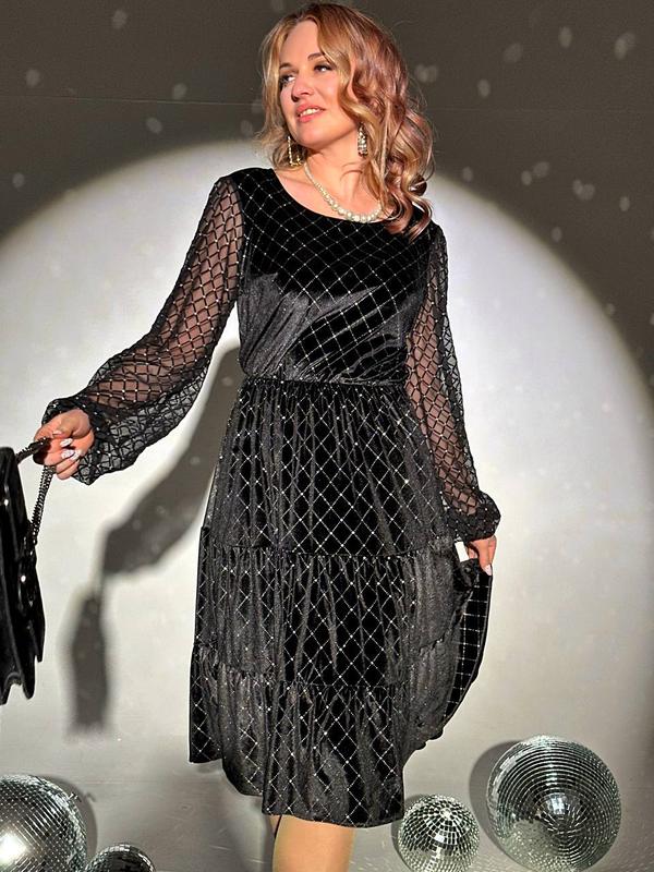 Сукня Модель 194 ✔️Розміри: 42-44,46-48,50-52⠀ Тканина : бархатний велюр з паєткою , рукава сітка , люкс якість Колір : чорний Талія та рукав на резинці Довжина 105 см
