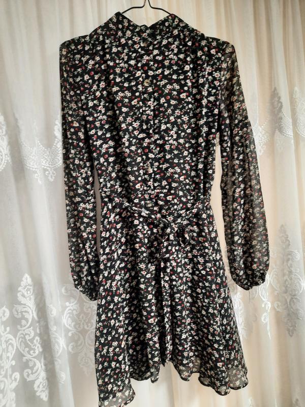 Платье в цветочный принт, на пуговицах с поясом. Прозрачный рукав. Д. платье - 89см Д. рукава - 62 см Полуобхват груди - 48 см