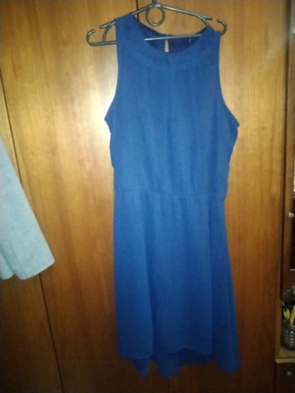 синее лёгкое платье, перед короче, зад длиннее. Смотрится изумительно на нежном стане .