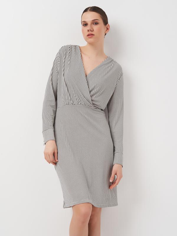 Облегающее фигуру платье из джерси до колен с V-образным вырезом и топом с запахом. Декоративные оборки на плечевых швах, длинные рукава с металлическими пуговицами на манжетах и присборенный шов на талии. Без подкладки. Возможно повреждение бирки 0923522_черн ромб_10