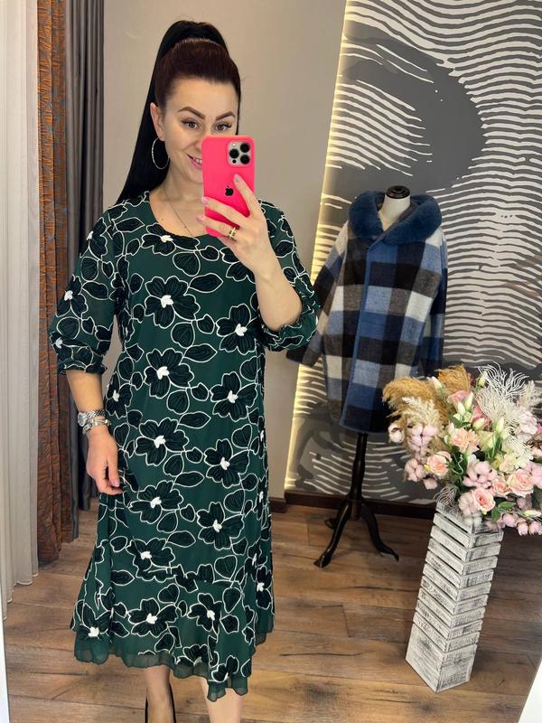 ніжна і романтична сукня вільного силуету дивовижно виглядатиме на вас на урочистому заході, сімейному святі і в повсякденному житті вільний крій сукні, рукав, що прикриває лікоть, невелика рюша по подолу, візуально роблять сукню легкою та витонченою, даючи змогу приховати можливі недоліки та підкреслити достоїнства, вона виготовлена з приємного до тіла креп шифону смарагдового кольору з набивним візерунком розміри: 50, 52, 54, 56, 58 довжина 119-120 см, об'єм грудей по виробу залежно від розміру від 114 см до 130 см, довжина рукава 53-54 см код L 8383G-2