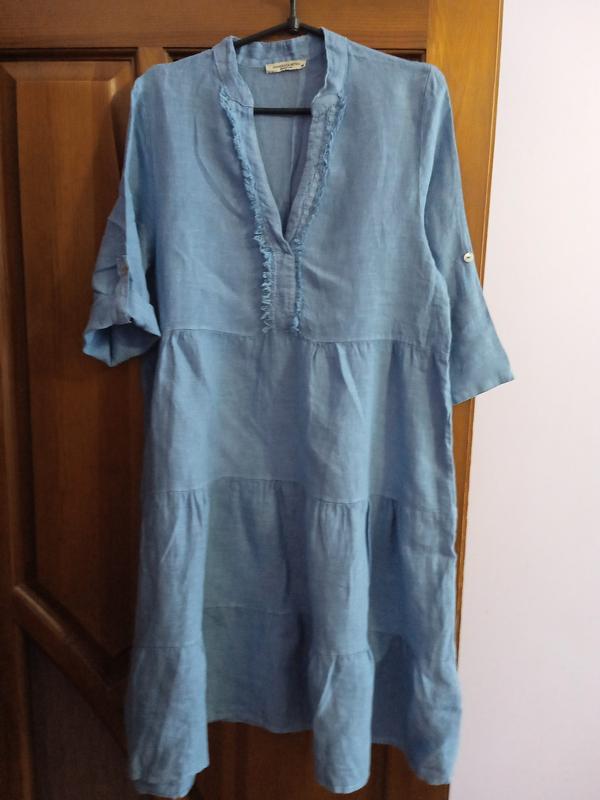 женское стильное платье FRANCESKA BETTINI. 100% лен.Стан идеален.Производство Италия. По бирке размер М, налегке на L, (см. замеры). Замеры: длина изделия по спинке 97, ширина плеч 39, max длина рукава 43, пог49.