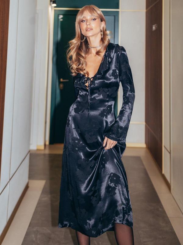 Вечернее атласное платье черная миди длины. Модель с V-образным вырезом дополненным воланом и шнуровкой. Длинные рукава с разрезами снизу. По талии расположены вертикальные вытачки, формирующие приталенный силуэт. Застегивается на скрытую молнию сбоку. Материал/cклад: атлас (50% хлопок, 50% вискоза); Растяжимость: нет; Длина изделия: 119 см; Длина рукава (от плечевого шва): 60 см; Параметры модели: 88х66х95, рост 170 см; На модели представлен 44 размер. ❗ Все заказы оформляются только через ЧАТ, через кнопку КУПИТЬ ➡️ отклонены. Страна производитель ➡️ Украина. 🚛 Доставка ➡️ "Новой почтой" (2-3 рабочих дня). Доставка сплачивает покупатель. 👛 Оплата ➡️ 100% Передача на р/р ФОП "ПриватБанка" или после платья с авансом. Если посылку не забираете, аванс возвращаем по учету транспортных расходов в обе стороны. 📦 🔁 Обмен и возврат ➡️ за счет покупателя, при наличии оригинального и невредимого упаковки и ярлыков, отсутствия следов эксплуатации, стирки и ношения.
