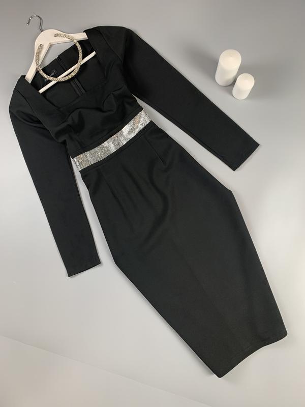 Сукня міді в благородному🖤чорному кольорі з щільної тканини від Paler_mod. Пояс спереді всипаний камінням. На спинці потайна блискавка. Ідеальний крій. Виглядає 😍 Якість відмінна. ▪️Склад: 73%бавовна+22%поліестер+5%лайкра ▪️Розмір: S ✍️Заміри: ПОГ-42см ПОТ-37см ПОБ-47см Довжина рукава-63см Довжина виробу-109см