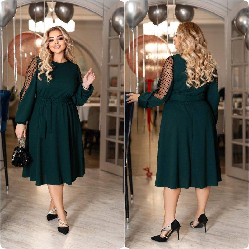 Тканина:креп- дайвінг Розміри: 50-52,54-56,58-60. Кольори: електрик, чорний,бордо,зелений. Довжина сукні - 115 см Довжина рукава - 65см. Заміри: 50-52р. Об'єм грудей - 110см. Об’єм талії - 104см. Об'єм стегон- 150 см. 54-56р. Об'єм грудей - 120см. Об’єм талії-112см. Об’єм стегон -158 см. 58-60р. Об'єм грудей - 128см. Об’єм талії-120см. Об’єм стегон- 166см. У комплекті пояс. fc