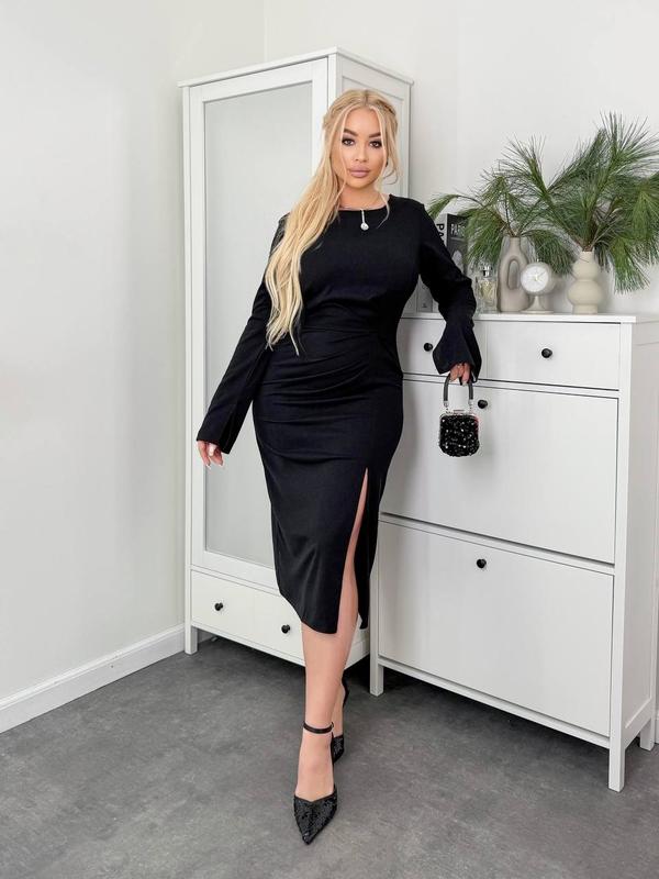 Сукня Мод RC-104 Размеры: 42-44, 46-48, 50-52 Цвет: черный Ткань : креп дайвинг Цена: 1200грн Вечная классика - силуэтное платье в черном цвете. Ткань красиво тянется, поэтому сядет по любой фигуре. За счет драпировки в области талии скроет возможные недостатки. А разрез на ножке делает ваш образ кокетливым и обольстительным.