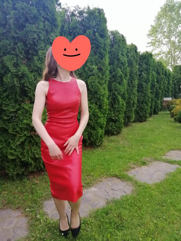 сукня з екошкіри на замші- еластична, не сковує рухів. Приталений силет з розрізом ззаді і замком на спині. Фото чорного плаття оглядове. Колір насичено червоний , матовий. Чудовий варіант як літо, так і на зиму