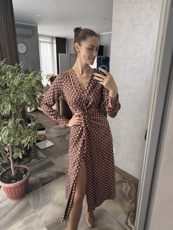 Платье Massimo Dutti, коричневое в белый горох, материал плотный атлас, можно как и днем надевать так и на вечер под красную помаду.