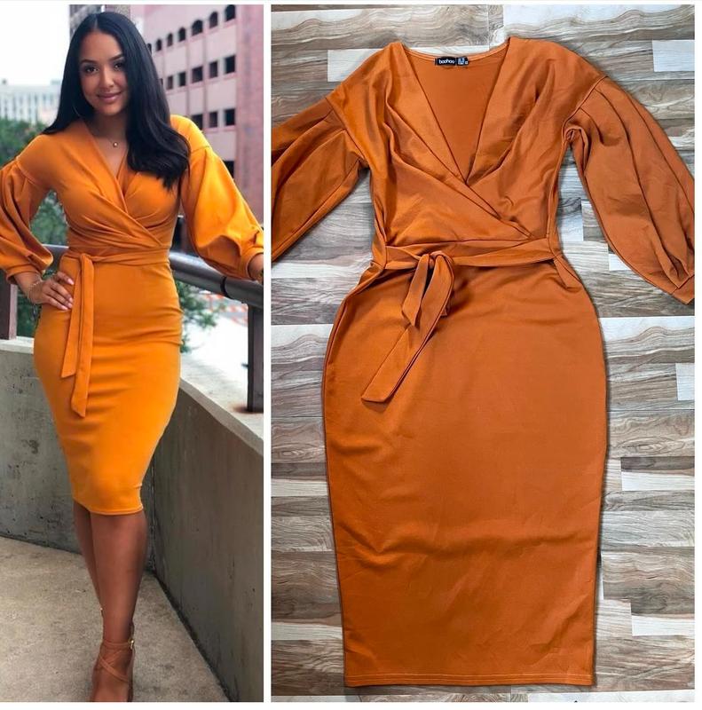 Міді сукня Розмір Л (або М) Красивий виріз Підійде на фігуру груша, бо робить акцент на верху та рукавах З чим поєднати на останній фотографії Міді