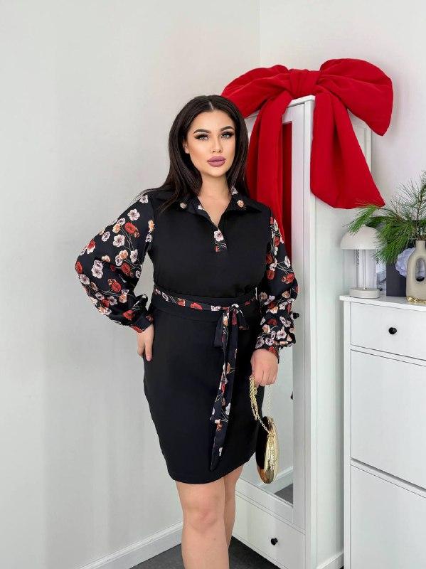 Сукня з поясом та объємними рукавами Тканина: крєп-костюмка та шовк Розміри:48/50;52/54;56/58 48/50: Ог-106 От-104 Ос-106 Рукав-63 Довжина-93 Далі + 6 см шм