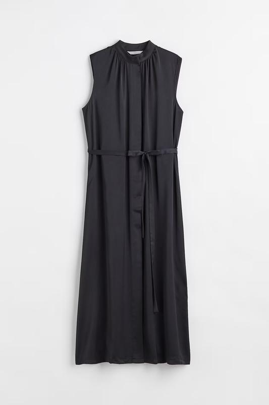 Розмір Xs (довжина 124 см,пог 44 см,поб 51 см.) Сукня без рукавів довжиною до литок із м’якої драпірування з невеликим коміром-стійкою, потайними ґудзиками спереду та вузькими зав’язками на талії. Збирається навколо коміра для ефекту ніжної драпірування. Без підкладки.