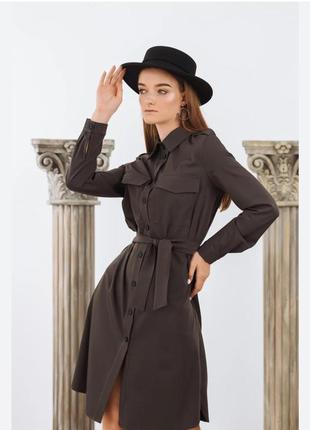 Платье-рубашка миди свободного кроя, воротник отложной, бретели на пуговицах, длинный рукав с манжетами и пуговицей, два больших накладных кармана спереди, застегивается платье на пуговицы, завязывается поясом в тон платью.