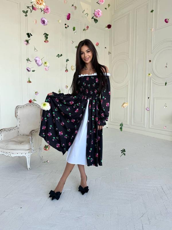 Трендовое платье миди Мод 237 Размер:42-44,46-48,50-52 Тканина:софт Платье длины миди, классический и беспроигрышный вариант на любой случай.Можная одевать со спущенными и приподнятыми плечиками. Рукава на гибкой резинке, благодаря чему платье легко регулировать.