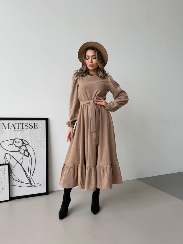 Трендовое платье миди Мод 101 ▫️Размеры:42-44,46-48,50-52 ▫️Ткань-вельвет на х<unk> б основе Описание: 🎀длина миди,120 см; 🎀рукав фонарик На талии резинка, одевается под пояс 📍