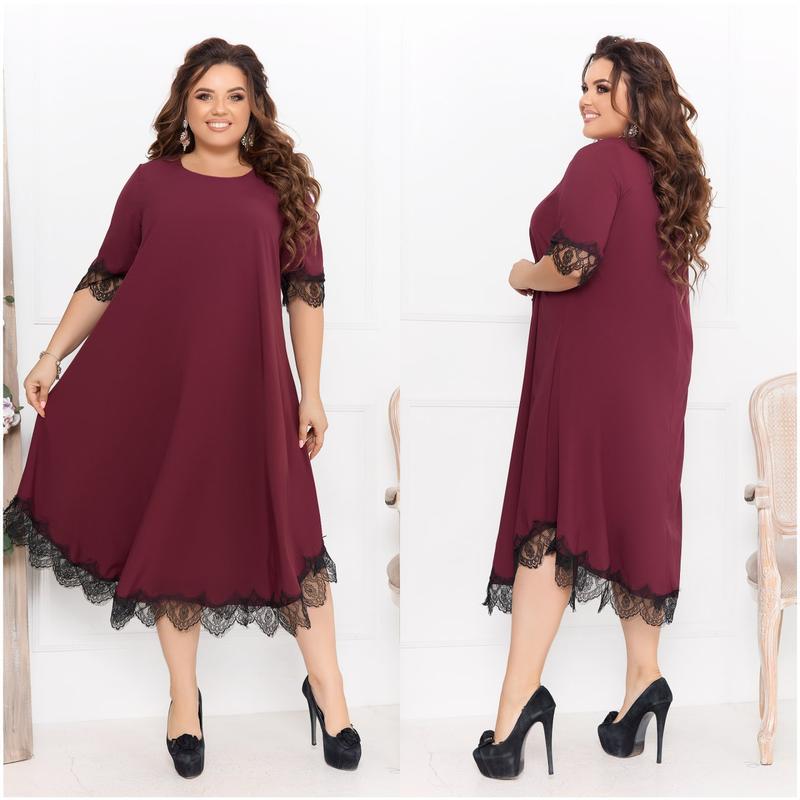 Сукня НОВИНКА💥💥💥 Код 3517 Цена 1000 грн. Тканина: софт. Цвета: мягко, черный, зеленый, красный, марсала, ярко-синий. Размеры: 48-50, 52-54, 56-58, 60-62, 64-66. Длина платья: 125, 126, 127, 128, 129 см. Длина рукава: 40, 41, 42, 43, 43 см. Обхват рукава: 38, 39, 40, 41, 42 см. Замеры готового изделия: 48-50 ОГ 104 ОТ 120 ОС 140 52-54 ОГ 112 ОТ 128 ОС 148 56-58 ОГ 120 ОТ 136 ОС 156 60-62 ОГ 128 ОТ 144 ОС 164 64-66 ОГ 136 ОТ 152 ОС 172 Невероятно стильное платье в вечернем стиле, длиной меди, А-образного силуэта. Вырез горловины круглый, застегивается на потайную молнию по спинке. Рукав длиной чуть ниже локтя. Платье по рукавам и низу декорировано черным кружевом. філат
