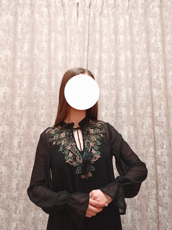 Платье имеет под низ накидку на бретельках, которая идет не сплошно с платьем. Ибо само платье более прозрачное. На груди вышит цветочный орнамент. Накидка на бретелька: Длина изделия (считывая бретельки) - 92см Ширина изделия полу обхват - 47см 100% - вискоза Платье: Длина изделия - 96см Полу обхват плеч - 40см Длина рукава - 62см Полу ОГ - 45см 100% - полиэстер Модель свободная.