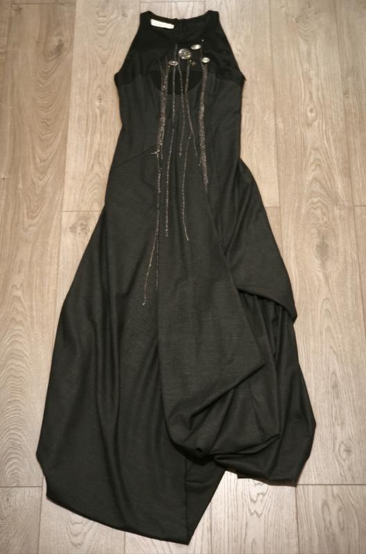 Дизайнерское платье сложного архитектурного кроя. Отшито из плотной смесовой ткани. Ассиметричный подол юбки, разнообразный и эффектный декор. застёжка сбоку на потайную молнию, есть подклад пог-40 см пот-36 см длина-+130 см