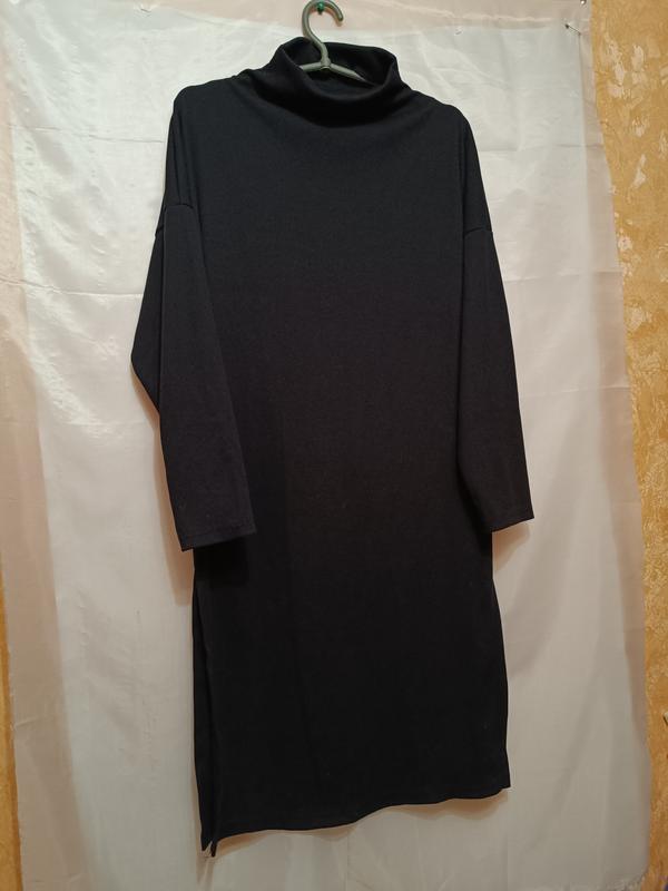 Платье средней длины с боковыми разрезами. Линия плеч спущена