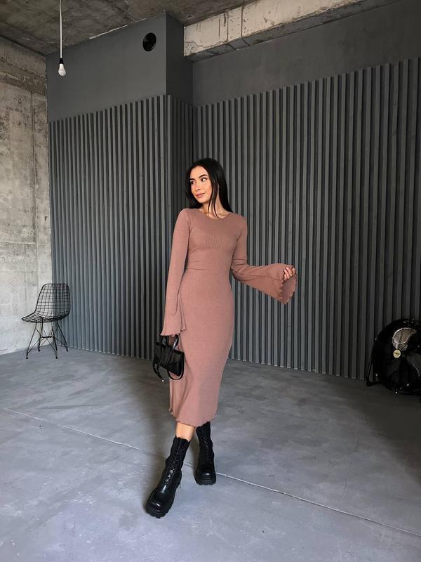 🔥🥰 платье миди в рубчик с завязкой на талии и рукав клеш в цветах мокко и черный 🔥🥰