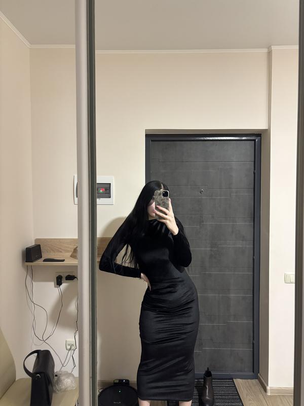 Чорна, велюр, з однієї сторони затягнута, повністю облягаюча, мій зріст (на фото) 165 см