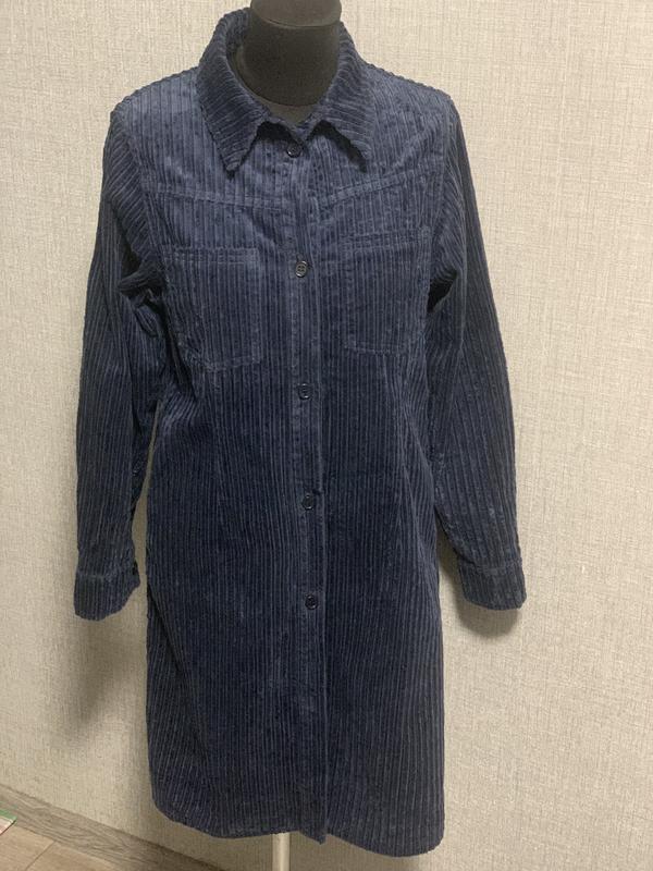 Темно синього кольору вельветова сукня в розмірі 36. Сукня має бокові кишені,новенька і без слідів носки. Довжина 90 ПОГруди 46 Рукав від плеча 60
