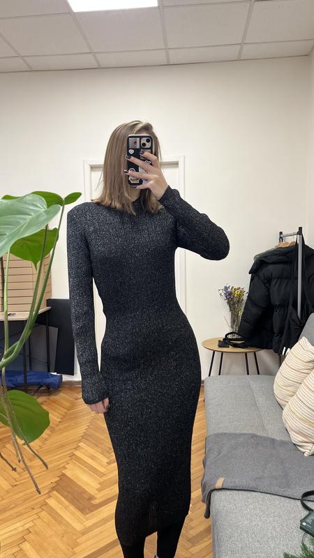 облягаюча міді-сукня - тканина рубчик з люрексовою ниткою, мʼяка (не колеться), гарно тягнеться і класно лягає по фігурі - дуже гарно виблискує та переливається - довгі рукавчки - розмір по бірці Л, але чудово підійде і на М - ідеальний стан, вдягалась 1 раз