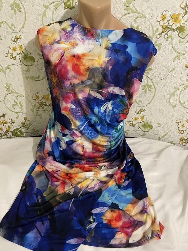 Сукня в ідеальному стані відомого виробника . Тканина дуже приємна на дотик. Добре тягнеться. Приховує недоліки фігури Заміри: ПОГ 50-58 см, ПОТ 43-55 см, ПОС 57-65 см. Довжина сукні 95 см