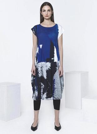 Платье с динамичным принтом из удобного эластичного джерси . Модель с короткими рукавами, облегающая верхнюю часть тела, с нежной формой тюльпана в области бедер. Подол обработан легкой резинкой, обеспечивающей небольшой сужение, а в боковых швах незаметно расположены карманы. пог-51 см длина-105 см