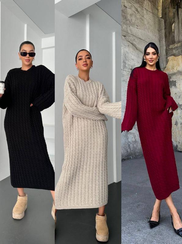 Вязаное миди платье свободного кроя туречица, платье прямое с круглым воротником, платье м...