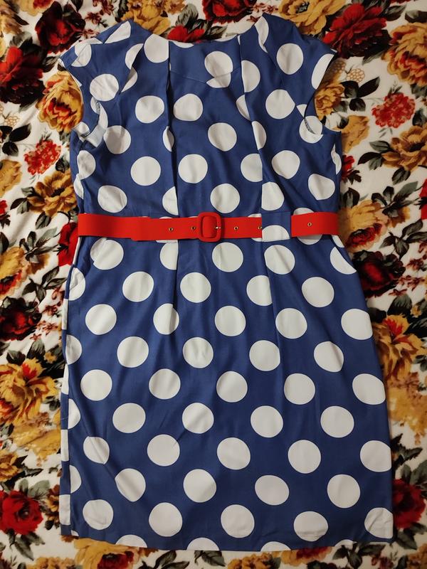 Продаю новое платье, без бирки, синяя в белый горошек с красным поясом, размер 50, 100% вискоза. Полуобхват груди 57 см, полуобхват талии 53 см, полуобхват бедер 60 см. Длина 100 см. Материал тянется