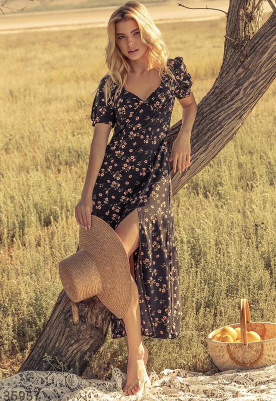 Чорна сукня-міді з контрастним квітковим принтом – ідеальний рецепт для створення романтичного настрою. Фігурний виріз каре та короткі рукави на манжетах підкреслюють ключиці та акцентують увагу на декольте. Приталений крій доповнений пікантним розрізом до лінії стегон.