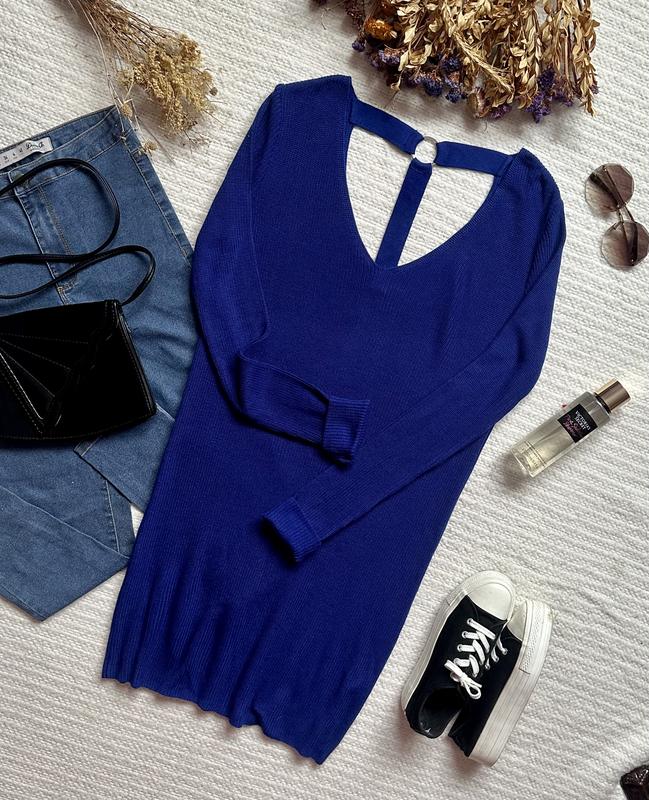 Яркое теплое платье миди свободного прямого кроя с оригинальной спинкой цвета электрик