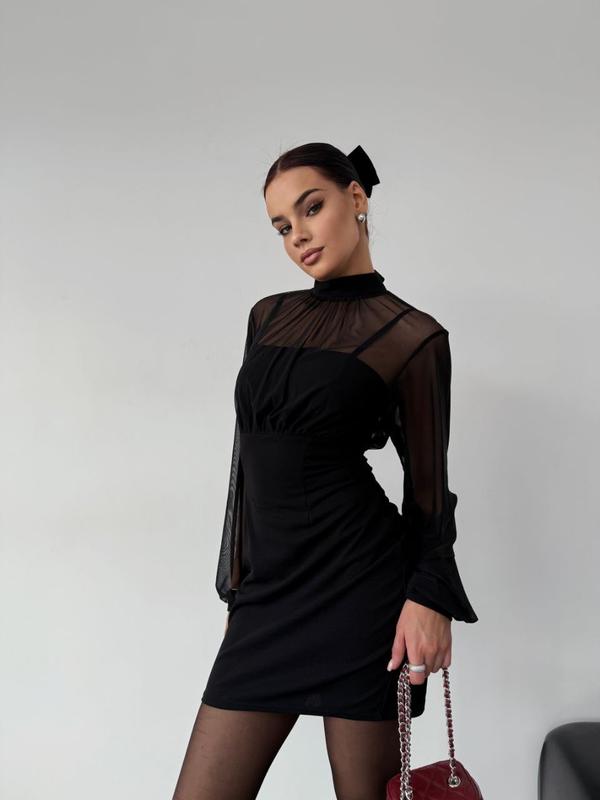 Сукня Модель 651 рб Ткань: крепдайвинг, стрейч сетка Размеры :42-44, 44-46 Цвета: черный NEW COLLECTION ✨️ Платье шикарное♥️ как будто просто черная, но как красиво подчеркивает ножки, а еще эти рукава, дууже красиво, и на работу и на свята 🎄❄️👑 Сзади на молнии, на шее завязки 🫶