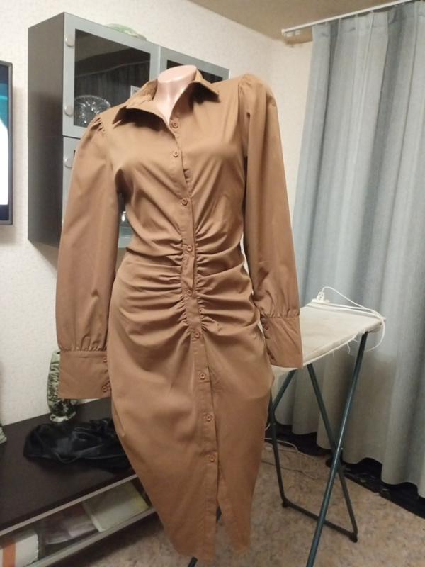 Шоколадный цвет. Длина 105см. Рукав на широком манжете, длина 64см пог 44см.