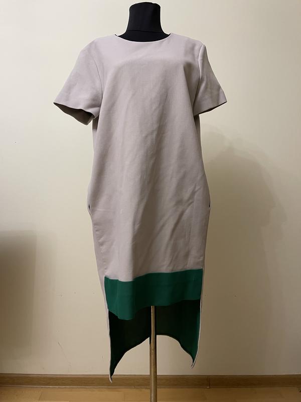 Платье интересного кроя 44 размера, COS. Ткань очень плотная, держит форму. Плечи 43 см, ПОГ 55 см, ПОС 57 см, длина переда 89 см, спинки 110 см, рукав 19 см. Стан идеален, без дефектов.