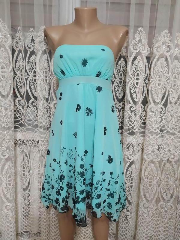 Сукня-бандо з асиметричним подолом від Jane Norman Гарне світло-блакитне плаття без бретелей із чорним квітковим малюнком Асиметричний поділ і плавна сітчаста накладка надають сукні приємного, ніжного та жіночного вигляду ширина по лінії грудей 40-49см, ширина в талії 36-40см, ширина в бедрах 55см довжина 68-75см