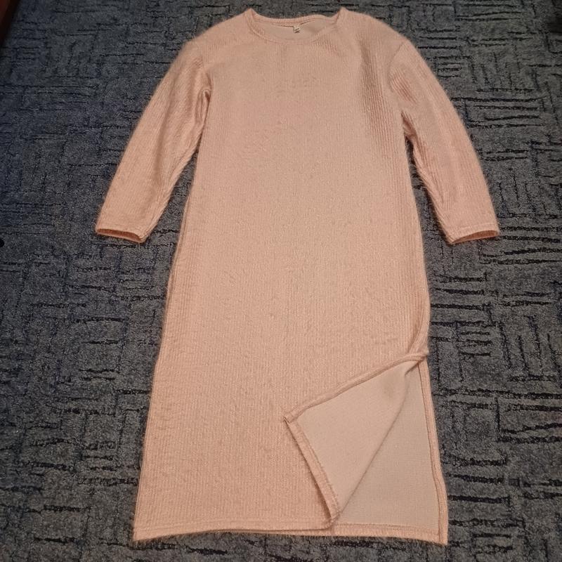 эидно розовое платье с пояском с левой стороны разрез по ноге она будто с ворсинками, что создает впечатления очень теплого платья. размер С -М