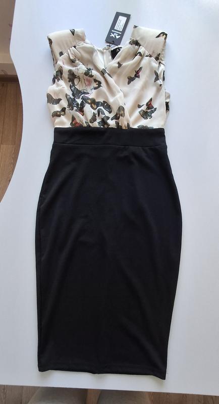 Комбинированное платье-миди от AX Paris сочетает черный подол облегающего кроя(трикотаж) и свободный верх, оформленный цветным флористическим узором на бежевом фоне, с запахом на груди, для придания формы имеются подплечники, застегивается молнией Цвет чёрный, бежевый Размер S-M Замеры: Плечи - 38см ПОГ - 45см + вытачки под грудь ПОПояс - 34см ПОБ - 44см Общая длина - 101см Новое