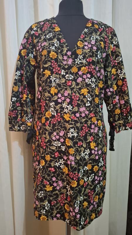 Сукня яскрава, рукав тричетверті з цупкої тканини, з кишенями, на рукавах зав'язки, гарно лягає по фігурі Плечі чуть опущені-41 ПОГ-51 Довжина-88