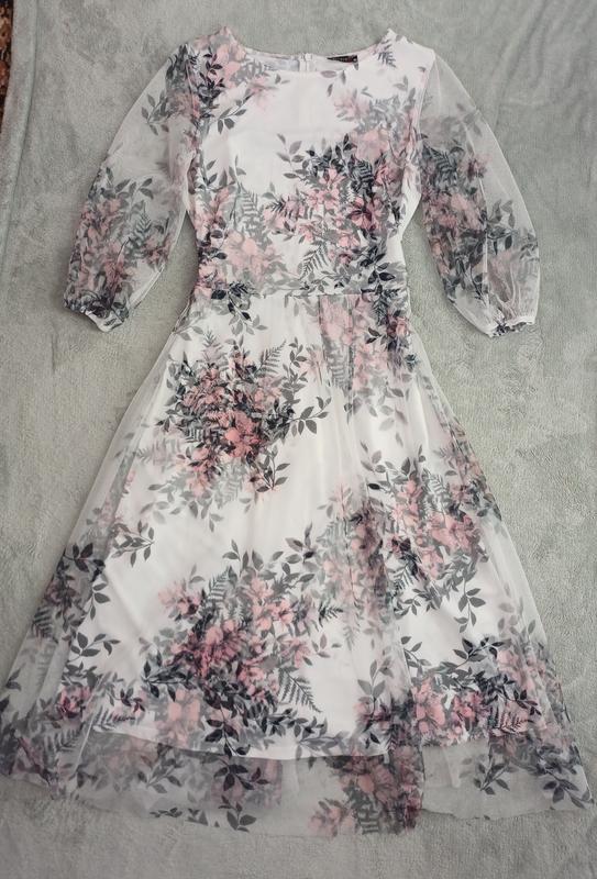 Очень красивое, легкое,воздушное платье, подкладка и сверху сетка, которая повторяет принт на подкладке.Идеальное состояние.Одягала два раза на праздник. Длина - 110 см Пот - 36 Пог - 44