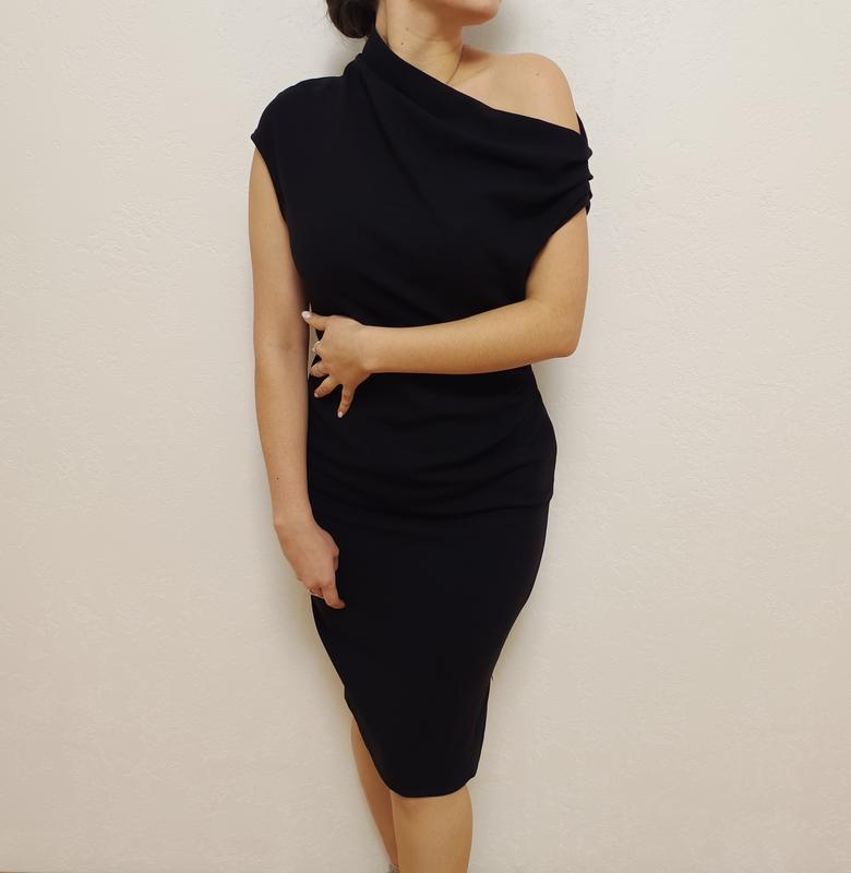 Элегантное платье-футляр от качественного британского бренда Rochelle Humes. Рошель Хьюмс - известная британская певица и танцевница, и стиль сыграл не последнюю роль в ее карьере. Именно поэтому один из крупнейших британских брендов решил создать вместе с ней ее собственную линейку одежды. Сдержанная, качественная и лаконичная - это точно о ней. Платье выполнено из смесового материала: полиэстер, вискоза и эластан. Полотно "тяжелое", структурированное, плотное, и при этом мягкое, нежное и комфортное к телу. Платье имеет интересный крой: приталенный силуэт, сборку на талии, асимметричный верх с открытым плечом. Золотая боковая молния не только служит декором, но и функциональным элементом, который позволяет легко надеть платье. Цвет антрацитовый, насыщенный. Лаконичная и в то же время акцентная вещь со своей атмосферой. Для примера прикрепляю официальный сайт бренда (образное платье в будет варить на нем около 50-60 фунтов) - https:/*************************************************** Размер: на наборе указан 12 размер, соответствующий M-L, и лучше ориентироваться на замеры. Замеры: ПОГ - 45 см, ПОТ - 38 см, ПОБ - 49 см, низ - 40 см, длина - 108 см, плечи - 51 см, ширина проймы рукава - 35 см. Состав: 60% полиэстер, 33% вискоза, 7% эластан. Параметры модели: ОГ - 84 см, ОТ - 68 см, ОБ - 96 см. Рост - 170 см.
