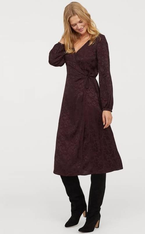 Длина 115 см ПОГ 49 см ПОТ 42 см ПОБ 55 см рукав 61 см. Ткань 100% вискоза. Платье длиной до середины икры из вискозной жаккардовой ткани. Треугольный вырез и запах спереди со застежкой на крючок. Отрезная талия с двумя потайными кнопками и узкими завязками с одной стороны. Длинные рукава со сборкой и узкими манжетами на пуговице. Без подкладки.