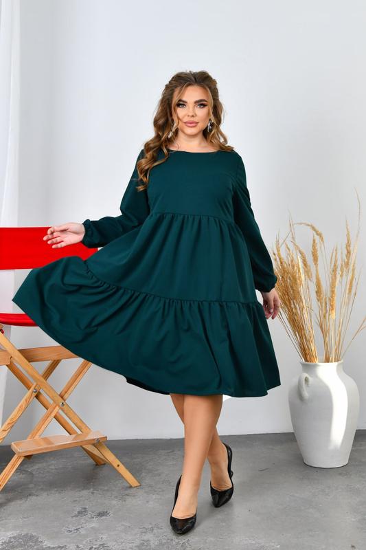Сукня НОВИНКА💥💥💥 В НАЯВНОСТІ✅✅✅ Код 3690 Ткань: креп-стретч (растяжимость средняя). Цвет: черный, зеленый, темно синий, бордовый, марсала. Размеры: 48-50, 52-54, 56-58, 60-62, 64-66. Длина платья: 105, 107, 109, 112, 114 см. Длина рукава: 63, 63, 63, 63, 63, 63 см. Обхват рукава: 38, 40, 42, 44, 46 см. Замеры готового изделия: 48-50 ОГ 104 ОТ 102 ОС 162 52-54 ОГ 112 ОТ 110 ОС 170 56-58 ОГ 120 ОТ 118 ОС 180 60-62 ОГ 128 ОТ 126 ОС 190 64-66 ОГ 136 ОТ 134 ОС 200 Стильное повседневное платье из трикотажа креп-стретч ( растяжимость средняя). Вырез горловины круглый, рукав длинный, на резинке. Юбка платья выполнена из двух ярусов. Застежек, карманов нет.