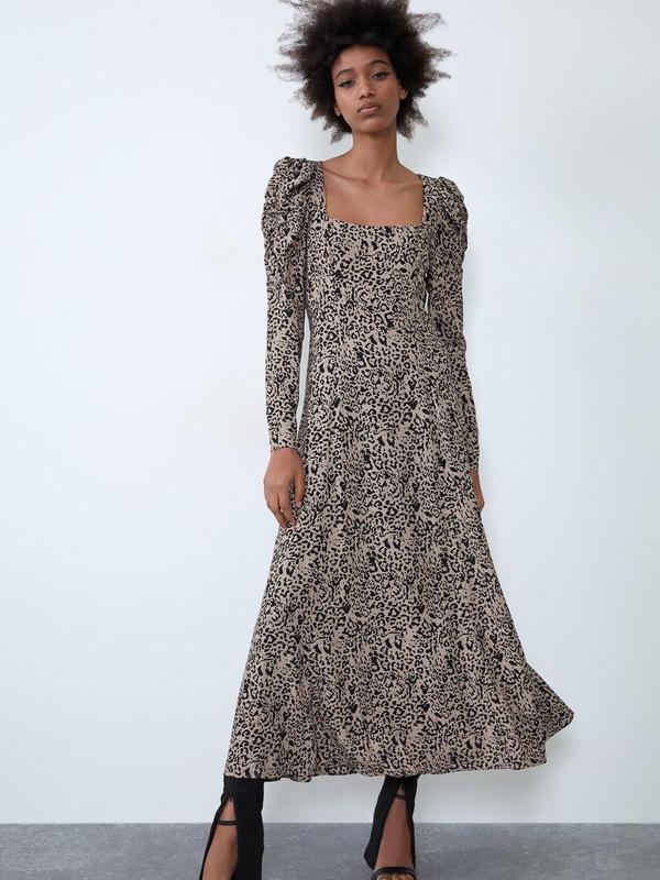 Красива сукня в леопардовий принт Zara 100% вискоза Стан - идеальный Размер S Замеры: рукав-62 см, полуобхват груди-42 см, полуобхват талии-32 см, полуобхват бедер-53 см, длина-120 см.